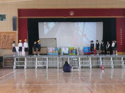 3年生は、今建設中のJR大阪東線の都島(仮称)駅にまつわる話や工事中の駅の様子、工事のことなどを探偵風に探っていきます。新しい駅への思いや期待を劇で表現していました。歌ありダンスあり大道具を効果的に使ったりとわくわくして練習を見ることができました。