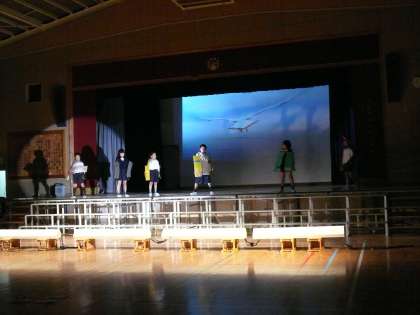 4年生の練習風景です。4年生は、1学期から環境問題について総合的な学習の時間の中で学習を進めてきました。今回の学習発表会では、学習したこから自分たちにできることは何か考え、発表します。衣装や大道具、小道具も自分たちで考え作っています。一人ひとりが学んだことをしっかり伝えようとする姿は、堂々としたものです。