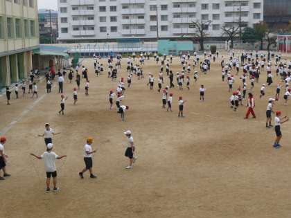 今週の月曜日から来週の金曜日までの2週間を「なわとび週間」と設定し、毎日15分の休憩時間に全校が運動場に出てきて、「なわとび」をします。体力の向上と運動に親しむことをねらいとして毎年取り組んでいます。