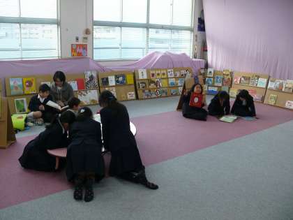 先週の金曜日から図書室で「えほんのひろば」が開催されています。図書室をカーテンで仕切り、テーブルではなく床に座ったり、寝転んだりしながら、絵本を読むスペースが作られています。周りには絵本が並びます。小さなお子さんでも一人で手に取れるように低い位置にあります。普段は手にしない絵本を、どうぞこの機会にご覧ください。明日まで、開催しています。地域の皆様も大歓迎です。3階、図書室までお越しください。