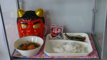 今日の給食は、節目の特別給食で「節分」でした。日本の文化として食育として、給食指導を実施しています。「節分」には、病気や悪い出来事を追い払うために「鬼は外、福は内」と言って豆まきをしたり、年の数だけいり大豆を食べたりする習慣があります。