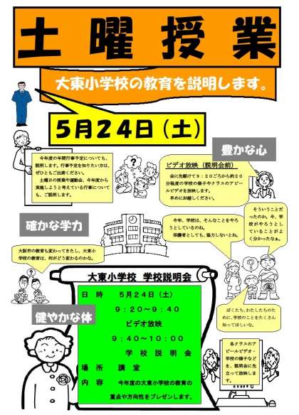まずは、9時30分より、昨年も好評だった「各学級の紹介ビデオ」を放映します。私も撮影現場を何クラスか見ましたが、昨年以上の仕上がりです。時間的には少し早いですが、ご覧になって損はさせません。ぜひ、この時間帯からのご参加よろしくお願いします。ビデオに続いては、学校説明会を開催します。「自分大好き! 友だち大好き! 大東 大好き!」今年新しく実施するものを含め説明させてもらいます。そして、その後のPTA予算総会にもぜひぜひご参加ください。昨年度は110名の参加がありました。今年度はそれ以上の方にご参加いただければうれしく思います。ぜひご来校ください。
