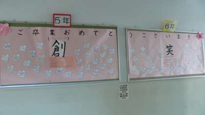 卒業式には、5年生が在校生代表として参加します。1年生から4年生の子どもたちは、この掲示板にメッセージを込めることで卒業式に参加しています。