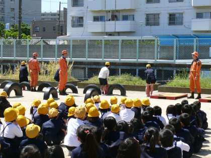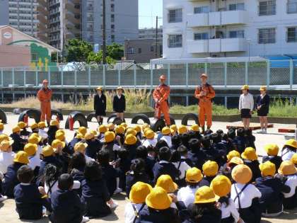 そのあと、水消火器を使っての消火体験、都島消防署の方からお話をしていただきました。