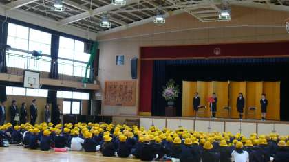 講堂で、まずは、着任の教職員の紹介のあと、いよいよ担当・担任の発表です。わくわくドキドキの発表でした。その後、クラス編成をして、教室に戻り、学級開きをしました。一斉下校での、子どもたちの顔からは、不安は消えて、さあやるぞ、さあ始まったという気持ちに思えました。