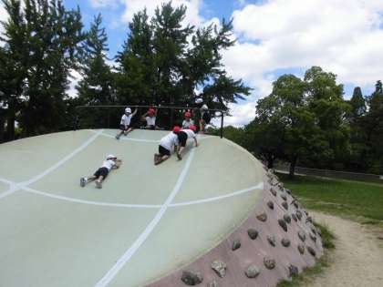 城北公園に着く頃には、みんなおなかぺこぺこで、いつもの給食の時間より少し早めにお弁当を食べました。昨日の雨で少し濡れていた遊具も、お弁当を食べ終わる頃にはしっかり乾き、大きな滑り台やうんていで楽しく遊ぶことができました。