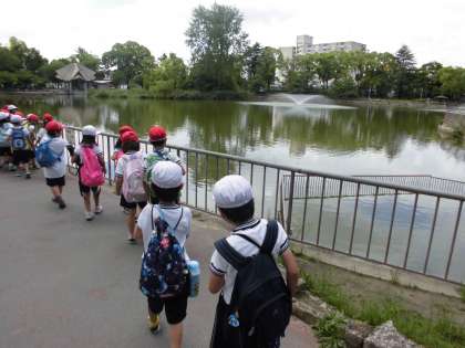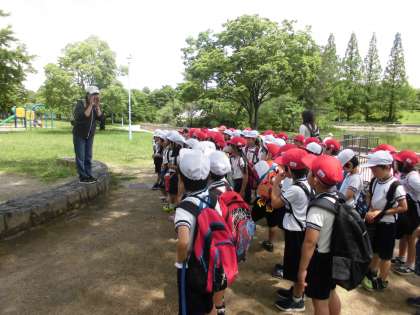 今日は1年生の春の遠足でした。本来行く予定だった5月30日が、雨天のため延期となり、昨日も雨だったので、また行けなくなるのではないかと子どもたちも気にしていましたが、とても良い天気の中、城北公園に行くことができました。行く途中で日吉神社や淀川わんどの景色をながめ、ヒバリなどの野鳥やシロツメクサなどの草花を見つけました。