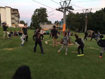 各班がこのために練習をしてきたスタンツで、他の班を巻き込んで盛り上がっていきます。合間には付添の先生たちのスタンツも入りました。
