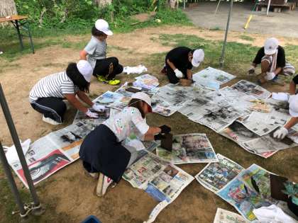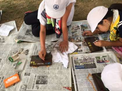 林間学習の楽しかった思い出に焼き板を作ります。どのように作るかというと、真っ黒に焼けた板を家から持ってきたタオルでひたすら磨きます。すると初めは真っ黒だった木がこすればこするほどつやがでて光り輝いてきます。そして、林間の楽しかった一コマをアルスカラーの塗料を使って描きます。さて、どんな作品になるか、出来上がりを楽しみにしていてくださいね。