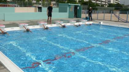 本校では、夏の水泳の集大成として「大阪市児童水泳記録会」に5,6年生が参加しています。交際大会も開催できる本格的なプール(旧なみはやプール)で泳ぎます。50Mプールを使用しているので、学校での50Mを泳ぐペースが違います。また、スタートの方法や泳法違反にならないようになど、大会向けの特別練習を実施しています。