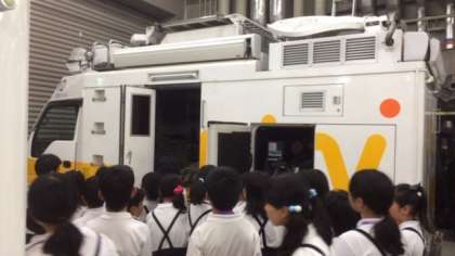 読売テレビでは、玄関ホールで説明を聞き、いざ、見学です。バラエティー番組のセットを組む前のスタジオの様子を見学し、セットが組まれました。セットの前で記念撮影。 また、中継車の見学もして充実した社会けんがくでした。