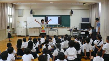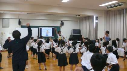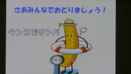 おなかが元気かを確かめるために、いつもバナナウンチが出ているかという話題になりました。ウンチは、おなかからのお便りです。出てくるウンチで、おなかの中の様子がわかります。学習の最後に「ウンチでサンバ」というダンスを踊り、1年生のみんなは大喜びでした。