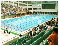 で、今年度から夏の水泳の集大成として、門真南にある「なみはやプール」の水泳記録会に参加します。写真のようなプールで大観衆の前で自分の泳ぎを試します。