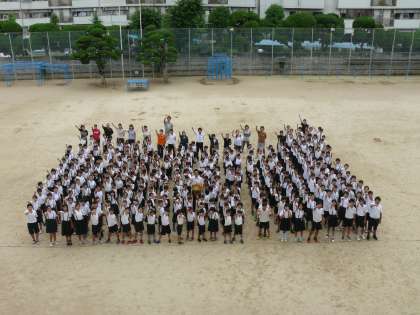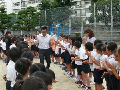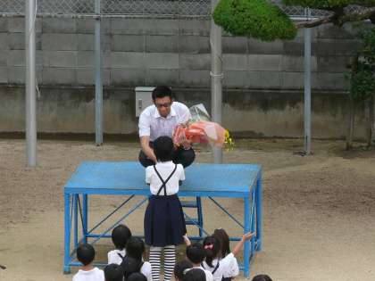 児童からのお礼の言葉と花束の贈呈をして、みんなで記念写真を撮りました。運動場もなんとか使用できて、全員で記念撮影。最後にお礼の花道を通ってもらい「夢・授業」をしめました。