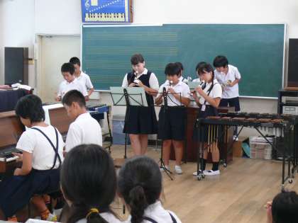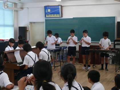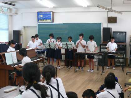 グループごとに演奏をして、他のグループの工夫を聞くことで、学習の広がりを持たせます。選択した楽器の組み合わせによって違う曲想に聞こえるのでとてもいい学習になりました。
