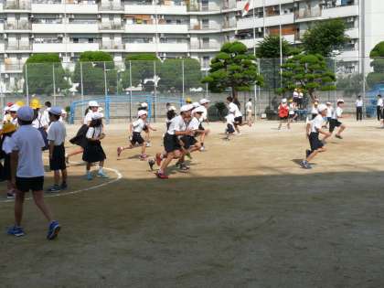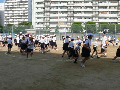 今日の児童集会は、集会委員会による「島おに」でした。気温は朝から32度。でも、この暑さにも負けず、子どもたちは汗をかきながら、元気よく走り回っていました。