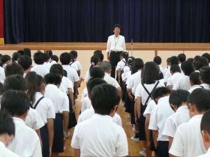 いよいよ終業式の日をむかえました。うるさいぐらいのせみの声、そして、蒸し風呂のような体育館の中でしたが、子どもたちは、しっかりと私の話を聞いてくれました。今日で終業式をむかえるのがもったいないくらい・・・・・。(と思って終えるのがちょうどいいのかもしれませんが)