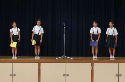 校長先生の話の後、1学期を振り返ってがんばったことを5年生代表の児童4名が発表しました。「できるまで何回もがんばりました」「初めての家庭科をがんばりました」「夢・授業で、山本貴司選手とバタフライで競泳でき、1番の思い出ができました」「自分学習に取り組み、自分で決めたことは自分でがんばることができました」と話をしました。