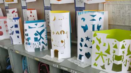 3年生は、カッターナイフを使って、幾何学模様やオリジナルの模様を切り抜き「タワー」「塔」を作ります。未来の都市を想像して画用紙を切り抜きました。色画用紙と合わせて、建てます。50を超えるタワーが並ぶと壮快です。当日は、ただ建っているだけでなく、もっと幻想的な仕掛けがあるらしいです。楽しみですね。