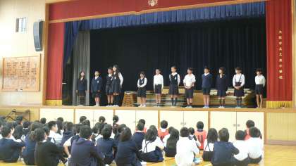 今週の木曜日の児童集会では、後期の児童会代表委員会の紹介でした。特に、今日は、4年生以上の学級代表の紹介でした。講堂に全校児童が会して、代表委員が自分の抱負を力強く述べました。今日の抱負の表明を聞いていると、頼もしく感じられ、児童会がますます活気強くなっていく予感がしました。期待しています。