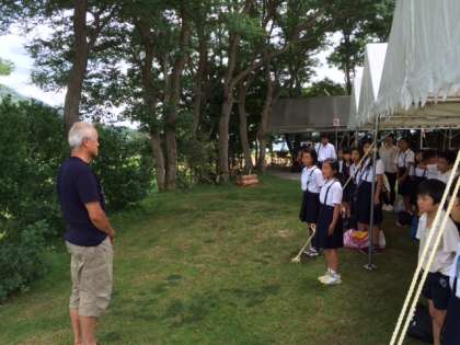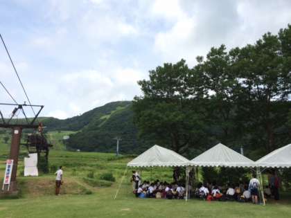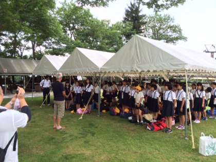 11:15に、無事到着しました。天気も申し分なく、全員元気です。到着してさっそく、開舎式をしました。「これから、3日間お世話になります。よろしくお願いします。」今から、宿舎の近所で、高原のおいしい空気もおかずにお弁当をいただきます。