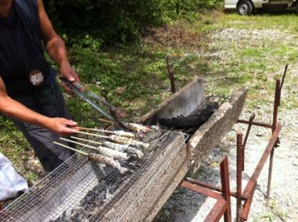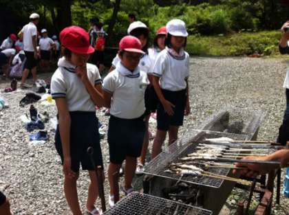 苦労の末、捕まえた魚をそのまま、谷常のお世話してくれる人のところまで持っていきます。そして、その場で、塩をつけて、串をを打ってもらい、そのまま焼いてもらいます。自分の捕まえた魚が焼きあがるのをじっと見つめながら待っているのもまたいいものです。