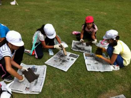 魚つかみで舌鼓を打った後は、「焼き板」の活動です。