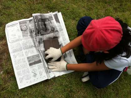 焼いて表面が炭になった板を、ひたすら磨きます。艶が出てくるまでひたすら磨き上げます。磨きが足りないと、艶が出ないだけでなく、持ち帰った時に汚れてしまいます。で、みんな必死になってみがいています。