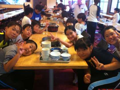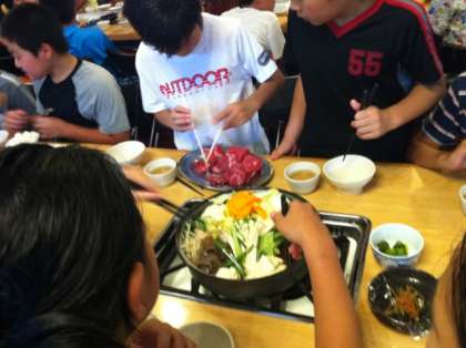 1日目のばんごはんの様子です。1日目は、すき焼きをいただきました。鍋をグループでつつきあいながらいただきます。ここのすき焼きは、絶品です。