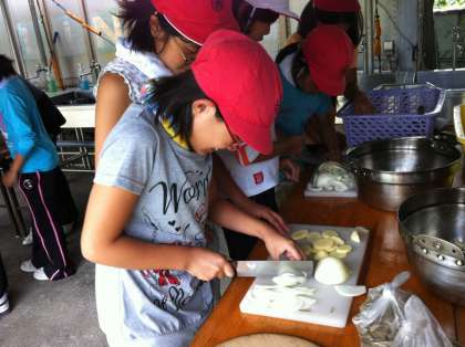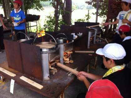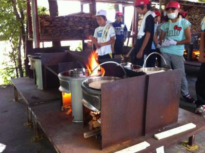 オリエンテーリングの後は、いよいよ「野外炊飯」です。今日は、カレー作りとご飯を炊きます。野菜などを切る担当、かまどのお世話をする担当、けがややけどをしないように、キッチンスタート!