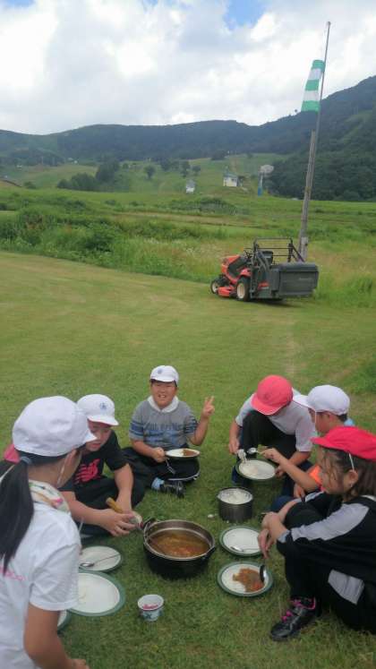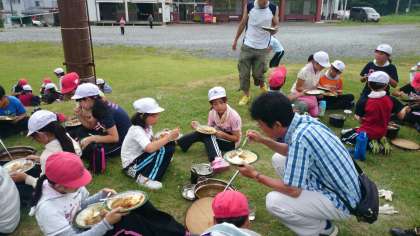 みんなの協力の甲斐あって、カレーライスが上手に出来上がりました。出来上がったグループから「いただきま〜す」。味はどうですかあ?もちろん「おいしいー!」