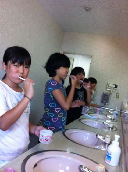3日目の朝食。段ボールレース前の腹ごしらえをしておかねば。と、朝の歯磨き。気分も盛り上げて。
