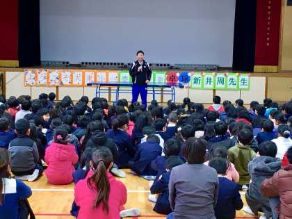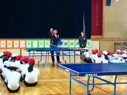 今日は、トップアスリートの「新井 周さん」を招いて講演と実技指導をしていただきました。新井さんは、アテネオリンピック代表、世界卓球選手権などで活躍されました。