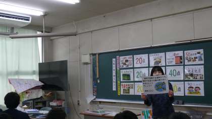今日の2・3時間目は、栄養教諭の先生を招いての栄養教室でした。「大阪の食文化」「なにわの伝統野菜」「給食探検」についてクイズ形式で食育活動に取り組みました。各班対抗のクイズでは、知らず知らずの間に食育についての知識を深めることができました。また「なにわの伝統野菜」では、給食の献立にも利用され、食していることもしることができました。最後には、「おおさかくいだおれ」の歌を教室の掲示用にいただきました。