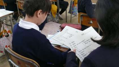 まず、5年生の教室で児童が学習している様子を参観しました。授業はでは、チャンツ(音楽に合わせての発音練習)や2人一組になっての英語で会話練習などに取り組んでいました。子どもたちは、とても楽しそうに、わくわくしながら学習に取り組んでいる姿がとても印象的でした。