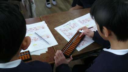 はじめて触るそろばんに苦戦している子どもも見られましたが、早く問題を解き終えた子どもが教え、クラスみんなが協力して学習していきました。