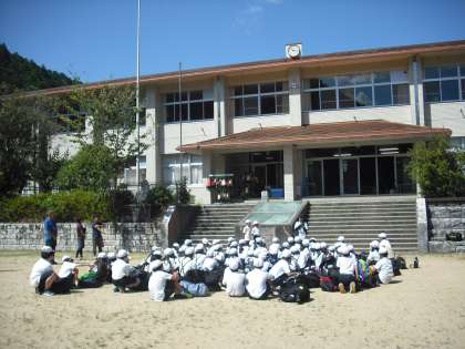 運動場で開舎式を行った後、一旦それぞれの部屋に入り、避難訓練をしました。