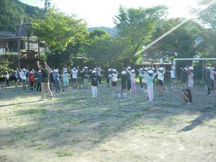 朝のつどいでは、ラジオ体操で体をほぐした後、昨日の振り返りと今日のプログラムの確認をしました。まだまだ眠そうな顔が見られます。