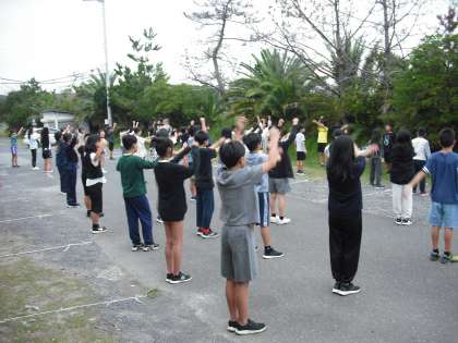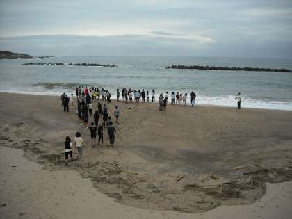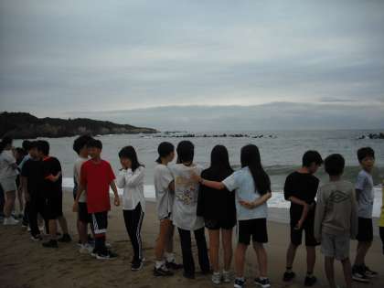 朝のつどいで、宿舎の目の前にある海岸に来ました。砂浜を歩き波と遊びながら海を見つめます。
