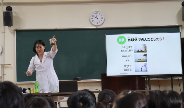 また、水以外の飲み物で薬を飲んだ時に効能が変わる場合があることを実験していただきました。
