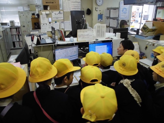 事務所では、「出勤時にアルコール検査をすること」や、「勤務時間が長く、朝は夜中の4時に出勤したり、夜中も泊まったりすることもある」などのお話を聞いたり、パソコンでは地図が表示してあり、各バス停に色がついていて、時刻の遅れがないかなどの確認がすぐできたりすることにびっくりしていました。