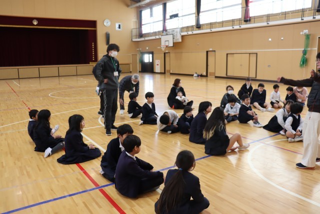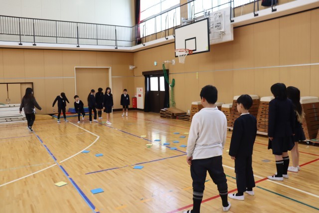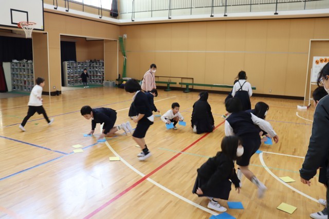 今回は「友だちと協力してなかよく遊ぼう」をめあてに、講堂でひっくり返しゲームやフラフープリレー、ドッジボールをして遊びました。