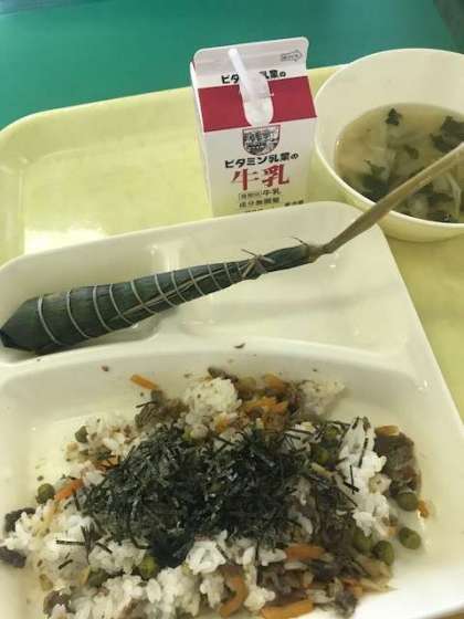 本日の給食は、こどもの日の献立で、牛肉のちらしずし・すまし汁・ちまき・牛乳でした。