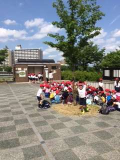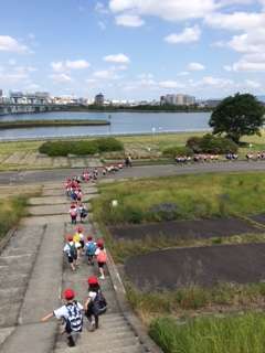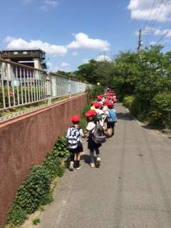 1年生の初めての遠足です。先生の話をよく聞いて、2列に並んで目的地の淀川河川敷をめざします。