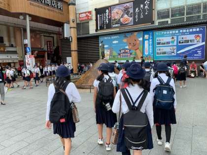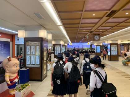奈良駅に到着。せんとくんと行基像が子どもたちを出迎えます。