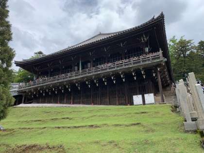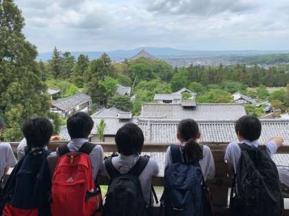 二月堂に到着。東大寺大仏殿や奈良の街並みを一望します。舞台は風が吹き抜け、とても快適です。外国人旅行者にHello!と声をかける子どもたちもたくさんいました。