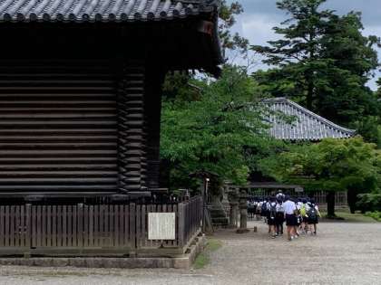 校倉造の倉庫を見ながら、新緑の中を昼食をとる場所に向かいます。耳をすませば、小鳥のさえずりも聞こえます。いろいろなことに気づくことができる1日です。