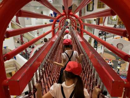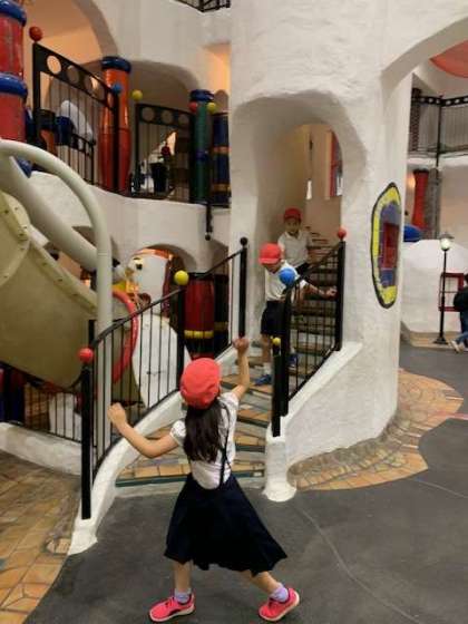館内中央にある吹き抜けの迷路は、一見どんな構造かがわかりにくく、迷路を抜けたところに橋や滑り台が現れるので、子どもたちは探検気分で回っています。