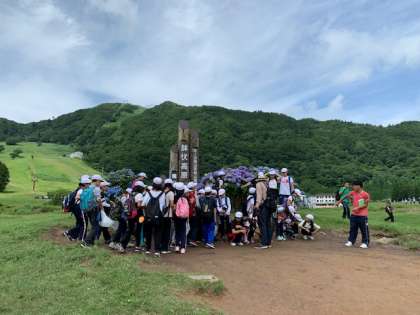 高原でクラス写真を撮影して、これから3・5・6・7組はネイチャービンゴ、1・2・4組は焼き板磨きをします。