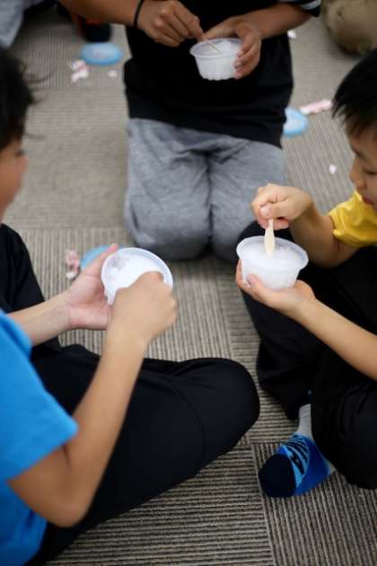 活動後は入浴、おやつ(氷菓)、ハガキを書く時間です。それぞれの部屋で班単位で過ごします。